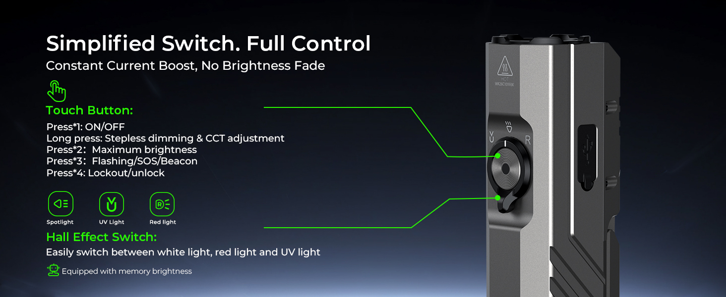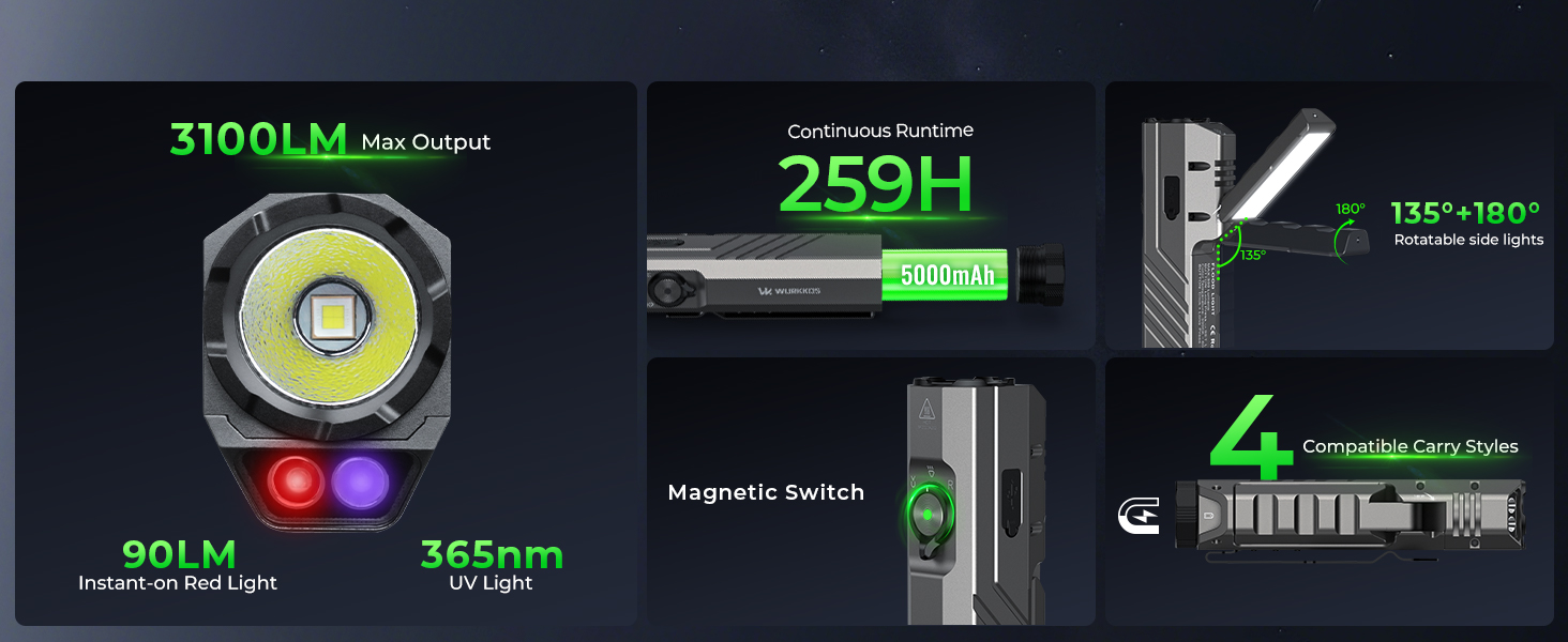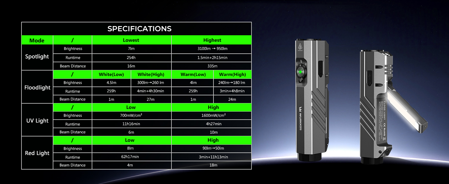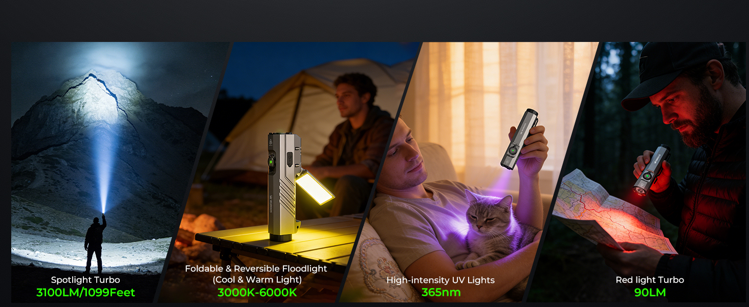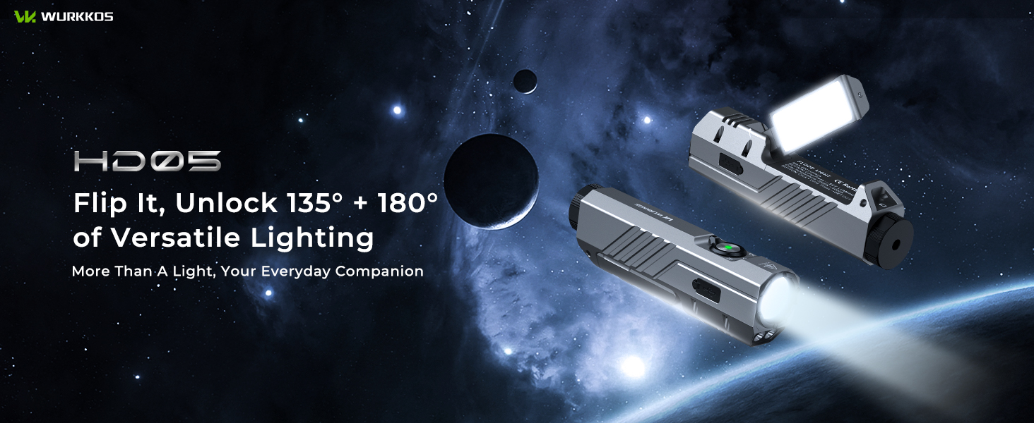 • 【New Release】Wurkkos HD05 Foldable 4-in-1 EDC Flashlight (Spot / Flood / Red / UV), 3100LM 335m Throw, Rotatable 180° Wing Floodlight (3000–6000K)