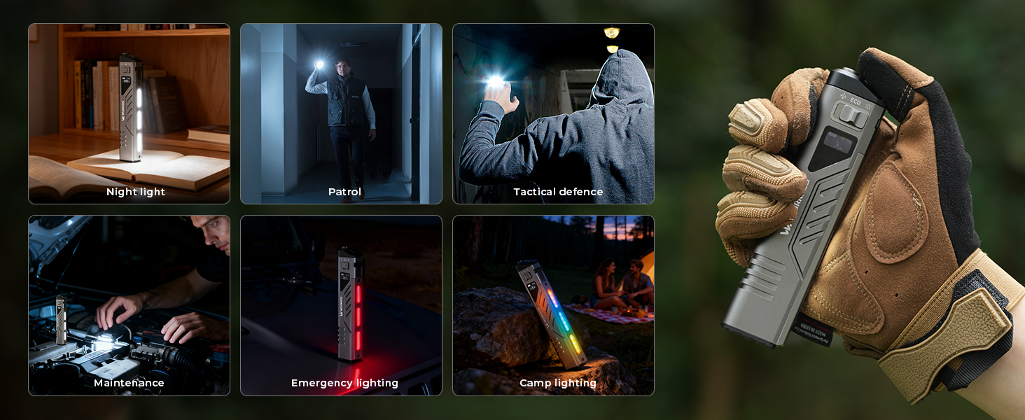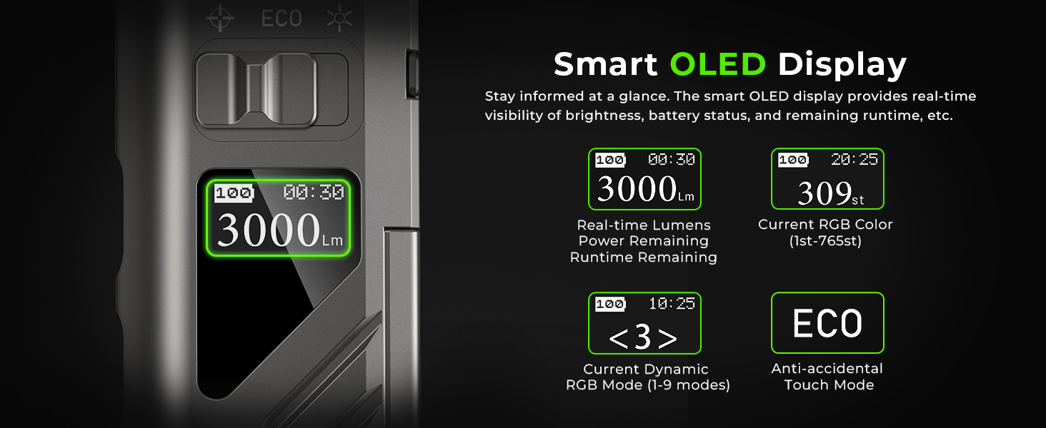 Smart OLED Display: Accurate & Real-time display. The screen gives you instant visibility into brightness, battery life, and runtime.