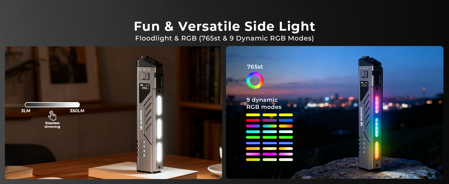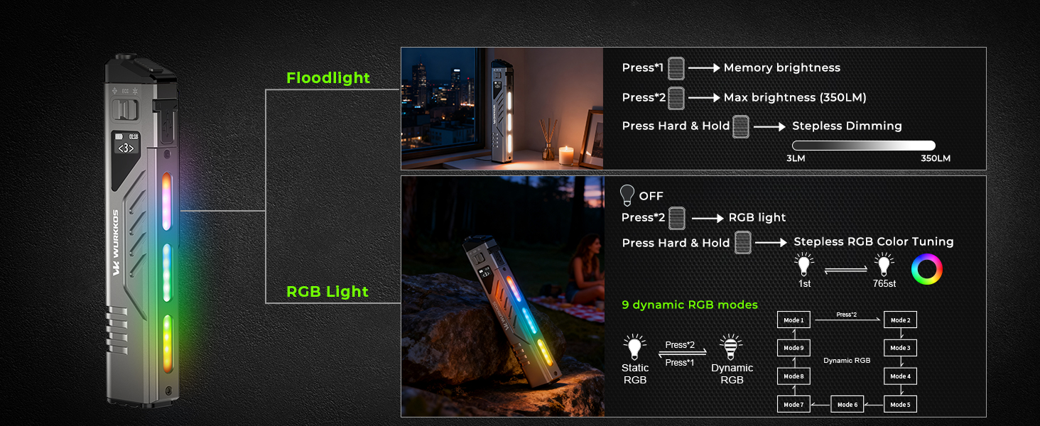 - Lighting Modes: Spotlight, Floodlight, RGB