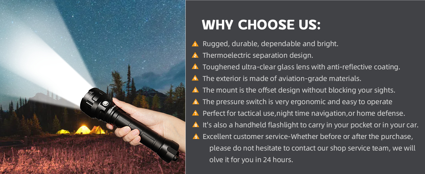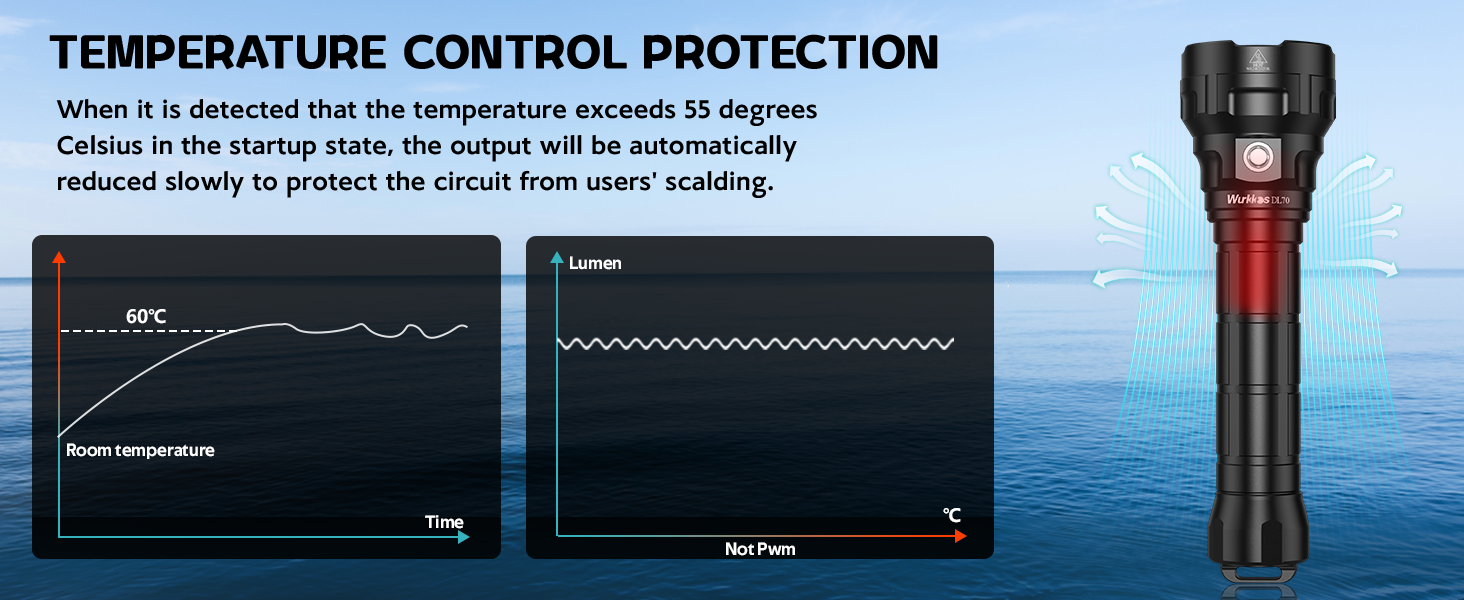 5. Smart Temperature Control & Low Voltage Protection for Safe Illumination The DL70 is equipped with an intelligent temperature control system that automatically reduces output when the internal temperature reaches 55°C, preventing damage. Additionally, the low voltage protection extends battery life. The toughened mineral glass lens is scratch and pressure-resistant, ensuring clear visibility in harsh conditions.