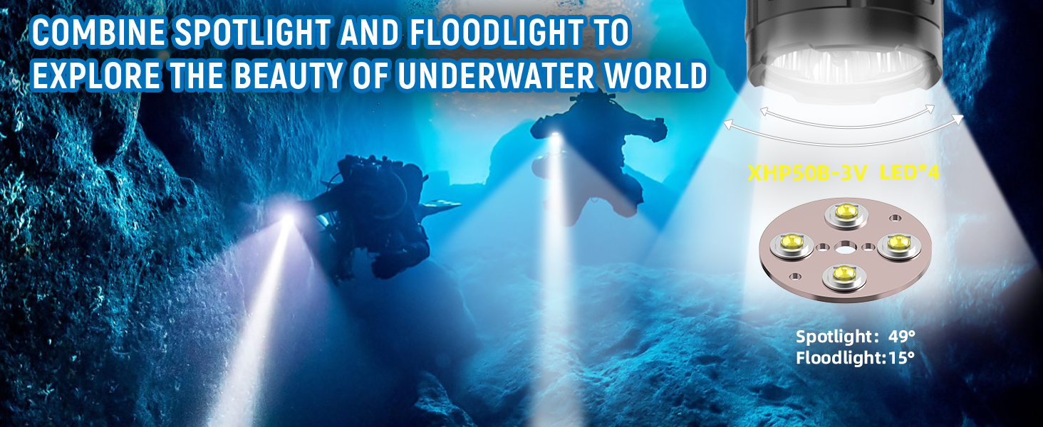 3. 15° Spotlight + 49° Floodlight, Precise Coverage for Every Underwater Angle The DL70 features a 15° spotlight and a 49° floodlight, balancing long-range focus with wide-angle illumination. The spotlight helps detect distant targets in deep water, while the floodlight offers broad coverage, perfect for cave diving, night search and rescue, and other complex environments.